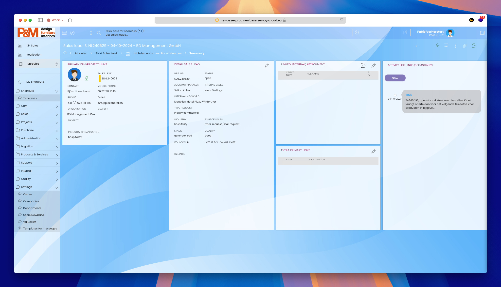 - Click on the colored bar in the top right and change it to the correct Company. In the example above it was a P&M Furniture Nederland BV Order so we will change that to P&M Furniture Facilities BV.